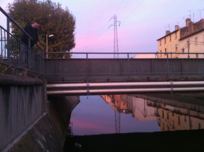 Coup du soir avec Pipo, on attaquera à 16h30 très en amont, dans très peut de fond, histoire de taquiner les petites perchettes. Le canal est très sale en surface, il y a beaucoup de feuille qui flottes et des dépôts jaunâtre ?!?. Pas de tapes ici, on redescendra le canal jusqu’au pont piéton qui nous est cher. J’irai commencer depuis le haut du pont, coté opposé aux escaliers, visant la bordure d’en face et la sortie de voute… Il y a deux jours, à cet endroit, Nico avait fait pas mal de fish, retentons pour voir. Et au premier lancer, alors que ma cuillère numéro 2 tombait sur une feuille et que je tirais dessus pour la faire sortir, qu’un silure jailli du fond, monta en surface pour la choper. Il claquera la surface avec sa queue mais rata la cuillère ! Cela me permis au moins d’en apprécier la taille, environ 1m50 !