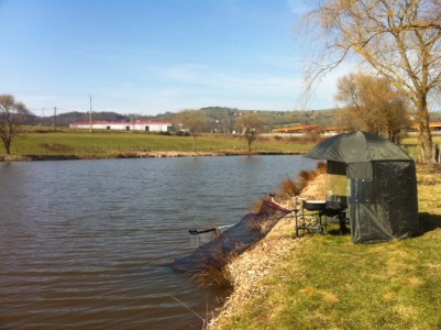 C’est donc à 6h30 du matin par 0 degré que nous entamons cette partie sur un haut lieu du carpeau. Nous étions déjà venu un week-end en 2011 sans que ce soit très agité, FredT nous en avait longuement parlé, nous insistons donc sur ce plan d’eau d’un peut plus de 1 ha. lol69 est déjà la et s’est installé sur l’un des postes convenus sur la rive opposée à la berge interdite. Beaucoup (trop) de pêcheur sont présent, c’est l’ouverture de la truite, et les sportifs amateurs de viande n’auraient su rater ça…