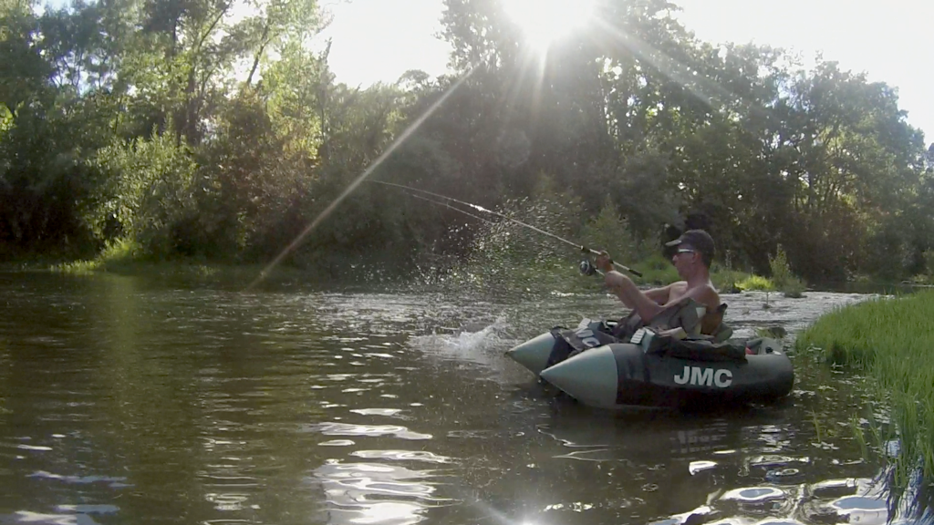 La mise à l’eau se fera par un petit chemin de terre par la rive gauche, que l’on empreinte au niveau du pont même ! Plus loin, des accès « relativement » corrects pour passer et embarquer avec les Float-Tubes. Des pêcheurs du bord sont déjà présents et nous oblige à contourner quelques bordures alléchantes.