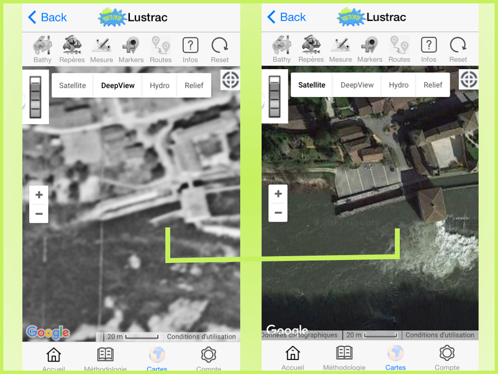 Le dessous du palier peut s’avérer être interressant, avec pas mal de fond à son aval, et des structures immergées aux abords du moulin comme on peut le voir avec la fonction DeepView d’iNav@FT69. Sur cet exemple on voit bien un ancien muret immergé qui à l’époque était bien en dehors de l’eau, aujourd’hui recouvert il offre un poste de pêche typique, on le voit d’ailleurs bien à l’oeil nu comme au sondeur.